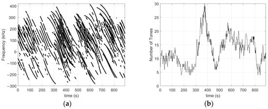 (a) Measured frequency of the tracked tones relative to the frequency Fo; (b) number of tracked tones.