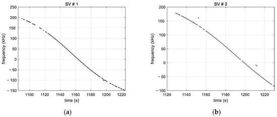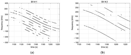 (a) Measured tone frequencies for satellite SV#1; (b) Measured tone frequencies for satellite SV#2, showing the difference in the number of tones tracked as well as the intermittent tracking. The latter is due to the low signal strength and the oscillating magnitude of the tones over time. The interruptions do not occur at the same time for tones of the same satellite because they have different amplitudes.
