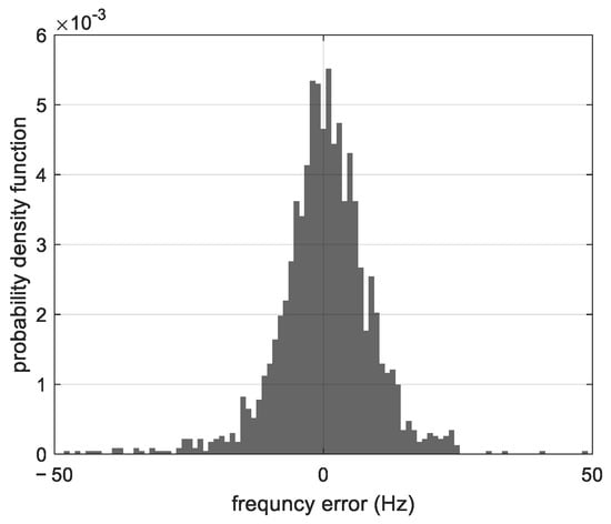 Figure 9 gives the probability density function of the tones’ frequency error computed with the measurements of the tracked satellites. This error is the deviation of frequency measurement curves with respect to their polynomial fit. It shows a non-symmetrical distribution of the error with a standard deviation of 10.92 Hz (~0.28 m/s). The frequency tracking error is mainly caused by thermal noise (with an expected value of ~4.5 Hz (1σ) in the case of C/No = 31 dB-Hz, T = 10 ms, and = 10 Hz) and by the presence of distortions in the incoming signal that we observed during signal tracking.