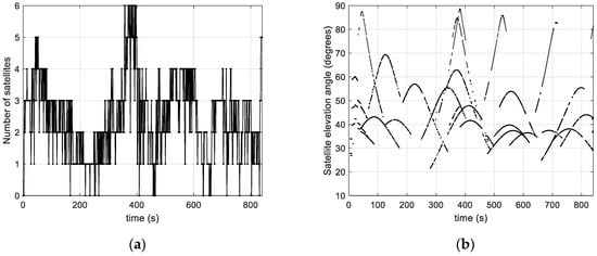 (a) Number of tracked satellites as function of time; (b) satellites’ elevation angles at measurement epochs.