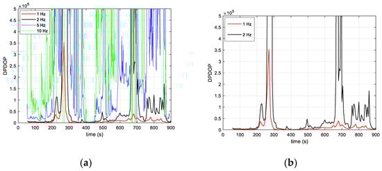 (a) Doppler position dilution of precision as a function of time for different values of the measurement rate (1 Hz, 2 Hz, 5 Hz and 10 Hz) in multi-epoch positioning; (b) zoom in for data rates 1 Hz and 2 Hz.