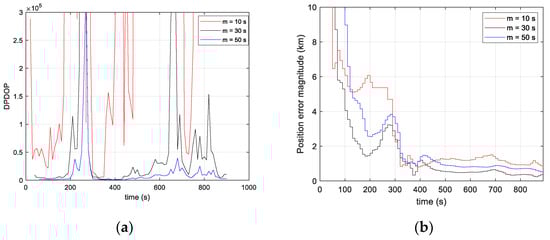 (a) Doppler position dilution of precision; (b) Position error magnitude. A comparison between three values of the multi-epoch interval duration, m.