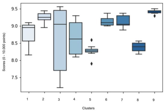 Boxplots with average and standard deviation scores for each one of the nine clusters that characterise the performance of the HTB. F = 5.859.