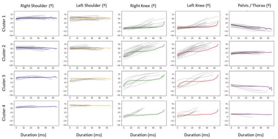Example of four cluster times series for phase 4 (i.e., from take-in to take-off on the vaulting table). In each cluster, the grey lines represent the time series of each trial for this phase of movement. The coloured lines represent the movement prototype that is the result of the average trials of each cluster and each joint angle.