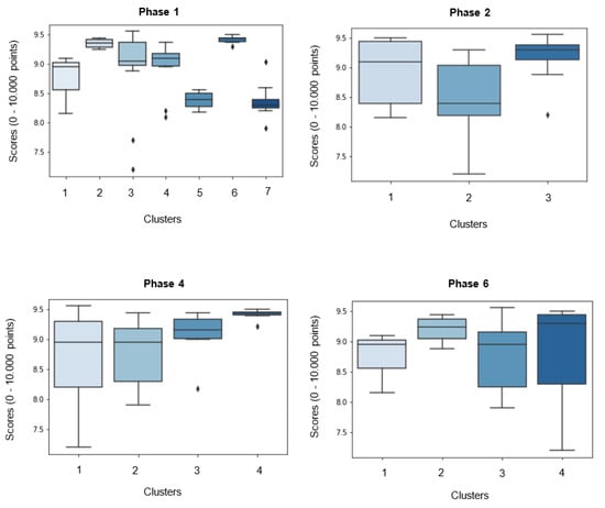 Statistically strong associations were found between scores and phases one (F = 5.083, p = 0.001), two (F = 12.303, p < 0.001) and four (F = 3.192, p < 0.032) and moderate associations with phase six (F = 2.074, p < 0.117) (Figure 5). This result reflects that in each of these movement phases there are statistically significant different scores for different clusters. During the first phase, clusters two and six show the highest average scores and a small standard deviation (SD). During the second phase, cluster three has a higher average score than the remaining clusters. Lastly, cluster four registered the highest average scores for phases four and six.