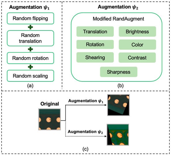 Inspired by FixMatch [,,], different augmentation strategies have been applied to labeled and unlabeled data. The augmentation methods are illustrated in Figure 2. Figure 2a illustrates the augmentation () of the labeled data of PCB_SS. Augmentation  comprised random horizontal/vertical flipping, translation, rotation, and scaling. For augmentation , as shown in Figure 2b, two transformations (translation, rotation, shearing, sharpness, contrast, color, and brightness) were randomly selected, along with the magnitudes of these transformations for a batch of images. The same predictions were expected from the unlabeled data when perturbed by two different augmentations (i.e.,  and ). For the PCB_FS model, augmentation  was used. The range of the transformations is listed in Table 3. For each epoch, all the input training data for the PCB_SS and PCB_FS models were replaced by the augmented data.
