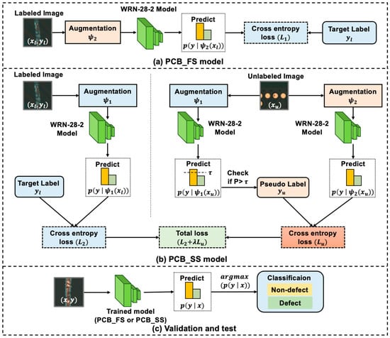 The PCB_SS model used labeled data, as in the PCB_FS model, as shown in Figure 3a, with augmentation  on the labeled data and leveraged the unlabeled data to improve generalization, as shown in Figure 3b. For unlabeled data, after applying augmentation , the model predicted the class of the image with the highest probability and assigned a pseudo-label if the probability was higher than a predefined threshold τ. The pseudo-label was used to compare the predicted output class from the augmentation  to compute the unsupervised loss function. The supervised and unsupervised loss functions were also calculated based on the CE loss. The implemented condition for the class with the highest probability of pseudo-labeling is as follows: