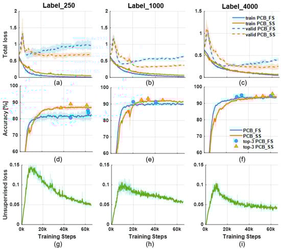 Learning curves during training for Label_250, Label_1000, and Label_4000: (a–c) total losses on training data (solid lines) and validation losses (dotted lines), (d–f) validation accuracies (circle and triangle: training steps of top three accuracies for PCB_FS and PCB_SS, respectively), and (g–i) unsupervised losses on the unlabeled data of the PCB_SS model.