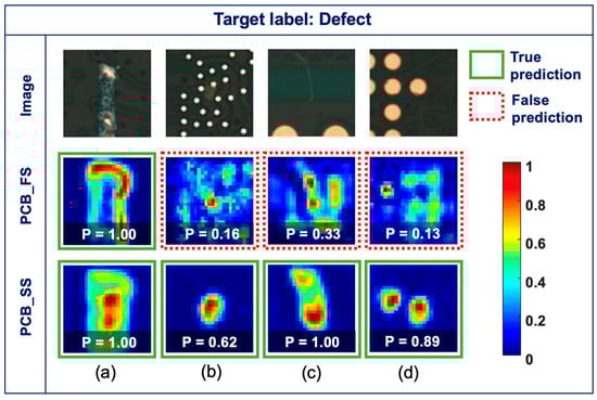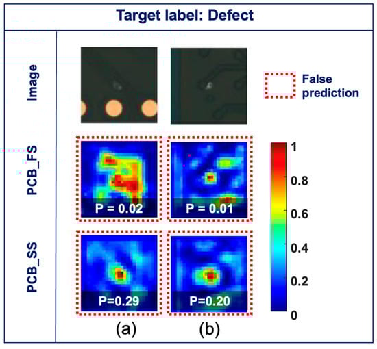 Figure 8 shows the original images (top row) and Grad-CAM maps obtained from the PCB_FS (middle row) and PCB_SS (bottom row) models for the defect classes and their corresponding probabilities. Figure 8a shows the images classified correctly by the PCB_FS and PCB_SS models with high confidence (i.e., the probabilities of the PCB_FS and PCB_SS models are 1.00). While the Grad-CAM maps from the PCB_FS model focused on the defect boundaries, those from the PCB_SS model focused on the defects more precisely. Figure 8b–d show hard cases of defects (e.g., unclear objects, thin scratches, and small pin holes). The PCB_FS model provides false predictions (i.e., classified as non-defects), which correspond to an incorrect focus from Grad-CAM, and prediction probabilities of 0.16, 0.33, and 0.13 for the input images in Figure 8b–d, respectively. In contrast, the PCB_SS model showed high activation at the defect locations with true predictions and prediction probabilities of 0.62, 1.00, and 0.89 for the input images in Figure 8b–d, respectively. Although the models were trained without information on the defect locations, decisions from the models were made based on the detected features.
