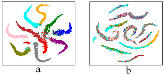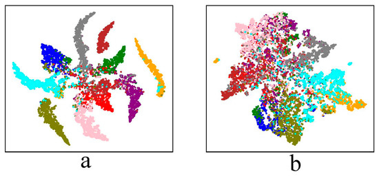 t-SNE visualization of the feature distribution of clean examples and adversarial examples of an 11-layer CNN trained for 100 epochs. Examples of the same color have the same ground-truth label. (a) Clean examples of the standard trained model. (b) Adversarial examples of the adversarially trained model.