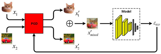 Suppose and are two adversarial examples with different real labels generated from Equation (3), and and are their one-hot real labels. Then, a random mixing ratio is generated from , and two sets of adversarial examples and real labels are mixed with this mixing ratio: