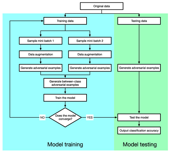 The training procedure of BCAT (+) is exhibited in Figure 4. There are three substeps in each training step. First, the threat model attacks the model using PGD to generate adversarial examples from clean examples according to the inner maximization of Equation (1). Second, the adversarial examples having different true labels are mixed two by two to generate mixed adversarial examples . Third, the mixed adversarial examples are used to train the model to output the mixing ratio. This procedure is iterated until the model converges. The overall framework representing the working mechanism of the proposed method is shown in Figure 5. The classification model is first trained using BCAT (+) on the training data. The adversarial robustness generalization performance of the trained model is then evaluated on the unseen testing data.