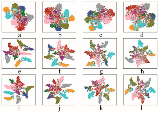 t-SNE visualization of the feature distribution of adversarial examples of ResNet34 networks trained using (a–d) standard AT, (e–h) BCAT, and (i–l) BCAT+ on CIFAR-10.