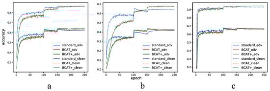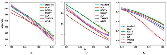In order to quantitatively analyze the robustness generalization and the standard generalization performance of BCAT and BCAT+ and compare them with the baselines, we first train several networks using BCAT, BCAT+, and the baselines on CIFAR-10, CIFAR-100, and SVHN. Specifically, ResNet34 and ResNet18 are adopted for CIFAR-10 and SVHN. WRN34–5 is adopted for CIFAR-100. The perturbation value of all evaluated defense methods during training is set to be 8/255 for CIFAR and 12/255 for SVHN. The number of steps and step size are set to be 7 and 2/255. Then, we test the robustness generalization accuracy and the standard generalization accuracy of these networks under PGD20 with a wide range of perturbation values described in Section 4.2. The experimental results are exhibited in Table 1, Table 2 and Table 3 and Figure 8.