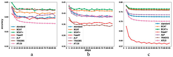 Robustness generalization curves of different defense methods under different attack steps on CIFAR-10, CIFAR-100, and SVHN. ResNet34, WRN34–5, and ResNet18 are used for CIFAR-10, CIFAR-100, and SVHN, respectively. (a) CIFAR-10. (b) CIFAR-100. (c) SVHN.