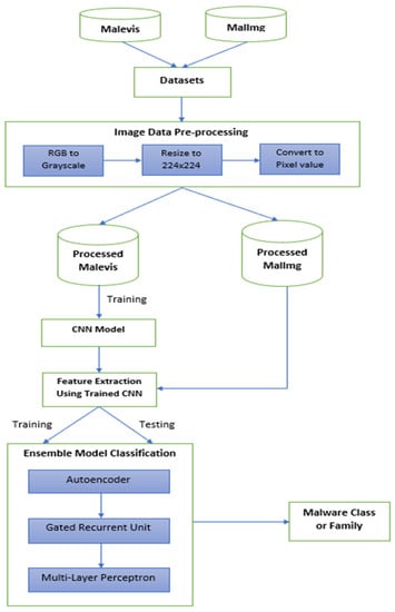 An ensemble of neural network models, SE-AGM, which consisted of an autoencoder, a GRU, and an MLP, was proposed, with the output of one model serving as the input for the next. During the data pre-processing stage, no special techniques were utilized. During the pre-processing stage, important tasks such as data augmentation, image resizing and reshaping, conversion of an image into pixel data, and normalization were carried out. The ensemble model was trained with malware features obtained from the MalImg dataset extracted using the concept of transfer learning for malware classification. For transfer learning, a CNN model was educated using another malware image dataset, the Malevis dataset. The last dense layer in the trained CNN model was removed and the new model was again compiled. This new model was then used for feature extraction. The autoencoder, an unsupervised model, was used to encode the long feature sequences into short sequences retaining the essential information about the malware. The GRU model was chosen because of its capability to develop with less training time and popularity in the field of malware detection. It was intended to check its feasibility in malware classification compared to other neural network models, especially CNN. It was trained on the encoded feature sequence obtained from the autoencoder model. The MLP model acted as the final classifier in the ensemble model which trained on the output generated by the GRU model.