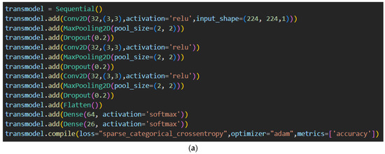 The convolution kernel of the convolutional 2D layer, which was combined with the layer’s input, yielded a tensor of outputs. When the convolutional layer was used as the initial layer, the parameter ‘input_shape’ was set as a combination of integers or none, but without mentioning the sample axis; for example, ‘input_shape’ = (224, 224, 1) for 224 × 224 grayscale images used in our case. The number of filters, kernel size, and activation function was set as 32, (3,3), and ‘relu’, respectively, for each of the convolutional 2D layers with an additional ‘input_shape’ attribute set for the first layer only. The MaxPooling 2D layer used each input channel’s maximum value throughout an intake window of a size given by ‘pool_size’ to downsample the intake along its axes (height and breadth). A dropout layer during the training period randomly set input units to 0 at each step to avoid overfitting. Using a Flattening layer, the resulting 2D arrays of pooled feature maps were compressed into a unique long continuous linear vector. A dense layer’s neurons were given one output from the layer above, which was received by each neuron in that layer. The dense layer applied the formula: