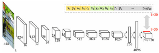 YOLO version 1 (YOLOv1) [24] uses 24 convolutional layers: 1 × 1 reduction layers (used to reduce image size) followed by 3 × 3 convolutional layers, and max pooling layers. The architecture ends with two fully connected layers. The result is a three-dimensional matrix of size 7 × 7 × 30, as illustrated in Figure 4.