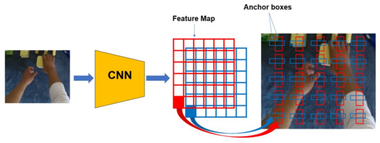 - Anchor Box: they are pre-generated bounding boxes (not model-predicted bounding boxes). With a grid, it creates some K anchor boxes with different sizes. These anchor boxes will predict whether it contains an object or not, based on the results of the calculation of the between it and the ground truth (if the , the anchor box is considered to contain the object). Figure 5 shows the process of using anchor boxes for object prediction in an image. YOLOv2 divides the image into 13 × 13 grid cells; so, the ability to find small objects is higher than that of YOLOv1, which is 7 × 7. YOLOv2 is trained on images that vary in size from 320 × 320 up to 640 × 640. This enables the model to learn more features of the object and have higher accuracy. YOLOv2 uses the Darknet19 with 19 convolution layers along with 5 max-pooling layers (it does not use fully connected layers for prediction but anchor boxes instead). Without using fully connected classes and using anchor boxes instead, the final result of the model will be 13 × 13 × 125. For each tensor of size 1 × 1 × 125, it is calculated as follows: (5 + 20), where and 20 is the number of pre-trained object classes. Darknet19 is very fast in object recognition; thus, it makes a lot of sense for real-time processing. The architecture is presented in Figure 6.