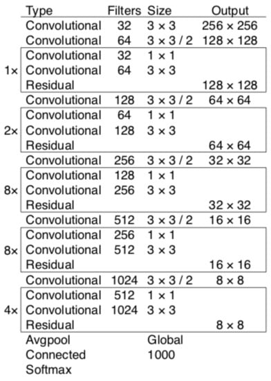 YOLOv3 [26] was born to improve on the weaknesses of YOLOv1 [24] and YOLOv2 [25]. YOLOv3 uses Darknet53 as the backbone (with 53 convolutional layers), as illustrated in Figure 7. YOLOv3 performs recognition three times on an image with different sizes. YOLOv3 has its output changed to , with S being the values 13, 26, and 52, respectively. With each grid box, there are nine different anchor boxes with sizes: grid cell 13 × 13: (116 × 90), (156 × 198), (373 × 326); grid cell 26 × 26: (30 × 61), (62 × 45), (59 × 119); grid cell 52 × 52: (10 × 13), (16 × 30), (33 × 23). The training process combines with the k-means clustering algorithm and uses the ground truth to calculate the error between the ground truth and the anchor box by adjusting values (), thereby learning the features of the object.