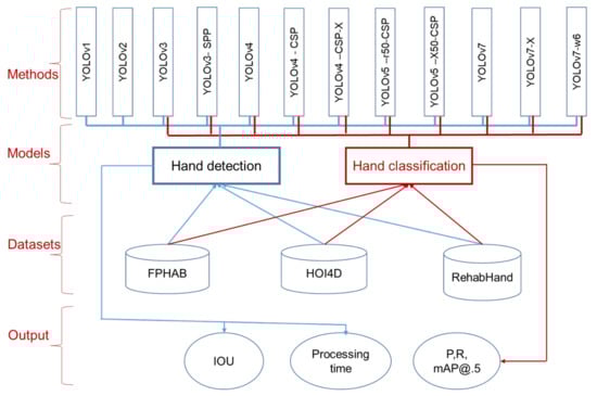 In this paper, we perform a comparative study on YOLO-family networks for hand detection and classification of the EV datasets. The taxonomy of the comparative study is illustrated in Figure 15. In this study, the methods are the YOLO-family networks whose development and improvements are presented in Section 3.1. Two models developed from the YOLO-family networks are hand detection and classification. The hand detection model is the main model tested on all YOLO versions; the hand classification model is only tested from YOLOv3 and later. The datasets used to evaluate the two models are FPHAB, HOI4D, and RehabHand, as presented in Section 4.1. The FPHAB database performs hand detection model evaluation and classifies action hands, background, and other objects. The HOI4D and RehabHand datasets perform the hand detection model assessment and classify left hand, right hand, background, and other objects. In Figure 15, we also present a comparative study of measures and outputs, described in Section 4.2 and Section 4.3.