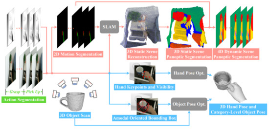 - Kwon, T.; Tekin, B.; Stühmer, J.; Bogo, F.; Pollefeys, M. H2O: Two Hands Manipulating Objects for First Person Interaction Recognition. In Proceedings of the IEEE International Conference on Computer Vision, Virtual, 11–17 October 2021; pp. 10118–10128. [Google Scholar] [CrossRef]