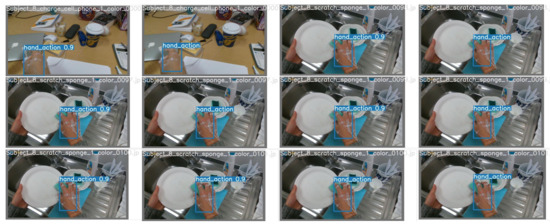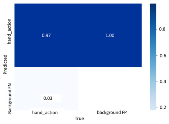 In Table 2, it can be seen that the hand action detection and classification results on the FPHAB dataset are very accurate; the results are greater than 95%, even if the , which is close to absolute accuracy. Table 2 also shows that P is usually greater than R in most cases. This is because in the image of the FPHAB dataset, there can be two hands and, as a result, there are many background areas that are mistakenly detected as the hand action, so increase. Therefore, R is smaller than P in many cases. The processing time of the hand action detection and classification process is shown in Table 1; it is also very fast to ensure the pre-processing step without much impact on the processing time of the construction applications.
