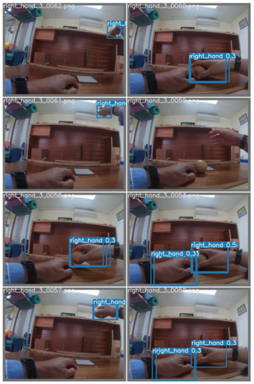 Figure 22 illustrates the results of hand classification on the HOI4D dataset based on YOLOv7. In Figure 22, there are many cases where the subject has the same color as the skin of the hand. However, YOLOv7 still detects and correctly classifies the hand.