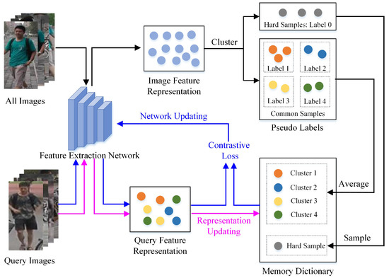 Figure 1 shows the overall framework of the proposed purely unsupervised learning person re-ID method considering complicated images. Given a set of N training images , we first use the feature extraction network to generate the initial image feature representations , and cluster the image feature representations into K clusters . Next, we construct a cluster-level memory dictionary D with items, including K cluster centroids and the image feature representation of a random unclustered complicated image. Next, we sample a batch of M query images from the training dataset, input them into the feature extraction network to obtain the query feature representations , and compute a cluster-level contrastive loss by comparing the query representations with the positive, negative, and complicated feature representations in D. At last, we train the feature extraction network with this contrastive loss and use the trained network to update the cluster centroids in D. The blue arrows in Figure 2 show the network training process and the pink arrows show the representative updating process of D after network training. Figure 2 illustrates one iteration of the method training, and it will take many iterations to achieve the optimal person re-ID result. Next, we will introduce the details of the proposed method.