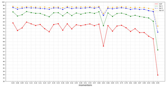 As mentioned before, we use the momentum updating method to update the vector representation of each cluster in the memory dictionary. The updating formula is shown in Equation (3). At each iteration and update, the updated vector representation of a cluster is composed of its original vector representation and the recalculated feature representations of the query images belonging to this cluster, where the ratios of the original vector representation and the recalculated image feature representations are and , respectively. is known as the momentum in the momentum updating method. Usually, a small value indicates a significant change to the original cluster representation at each update, and a big value indicates a small change to the original cluster representation at each update. Here, we attempt to use different momentum values and observe the person re-ID performances when using these different momentum values. Specifically, we experiment with 33 different momentum values and their person re-ID performances are reported in Figure 2. As we can see from Figure 2, momentum values smaller than 0.9 can always generate good person re-ID performances, while momentum values larger than 0.9 always result in a poor performance. Therefore, we set as 0.1 in our method.