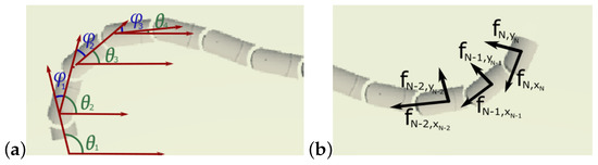 To define the robot’s configuration, there is a differentiation between link angles and joint angle indicated in Figure 1. A link angle is defined as an angle between the link and a global x-axis, while a joint angle is a difference between the link angles of two neighbouring links . The vector defines the controllable parameters–actuator torques exerted on successive links. The and vectors represent components of friction force on the links in global x- and y-directions. This model assumes viscous friction forces acting on the mass centre of the links. The friction force is defined in a local coordinate system attached to each robot’s segments, as shown in Figure 1. Friction force is proportional to the segment’s linear velocity and coefficients and :