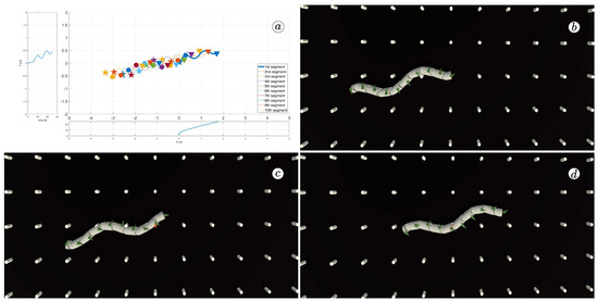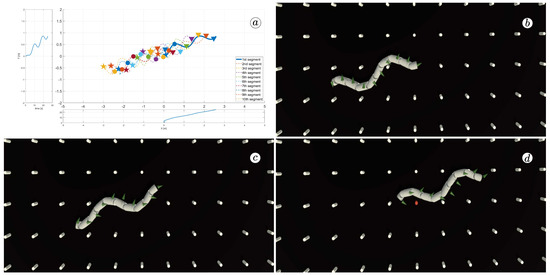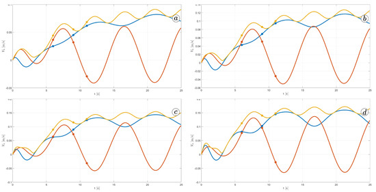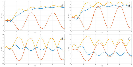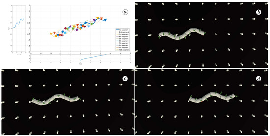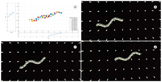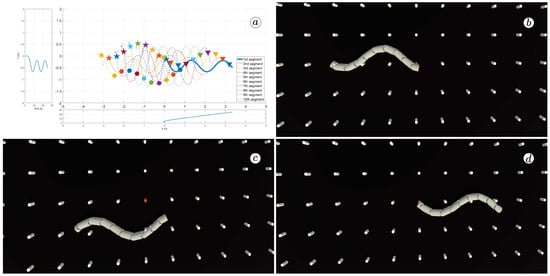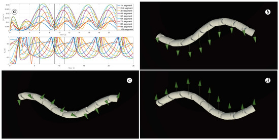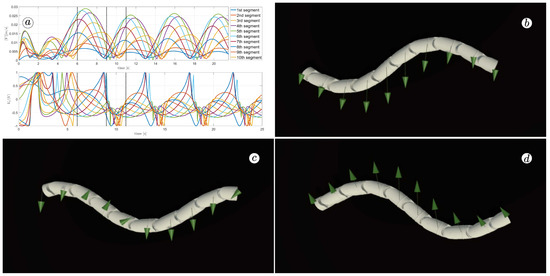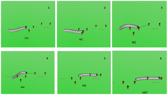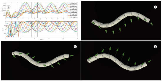 Analogous experiments were performed for , , and a sequence of different phase shifts: , , , . As we can see from Figure 29, Figure 34, Figure 35 and Figure 36, the robot’s shape is the same but the movement direction changes. The values of joint angles, derivatives of joint angles, and torque remain the same for all phase shift values (see Figure 37, Figure 38 and Figure 39, and Table 3).