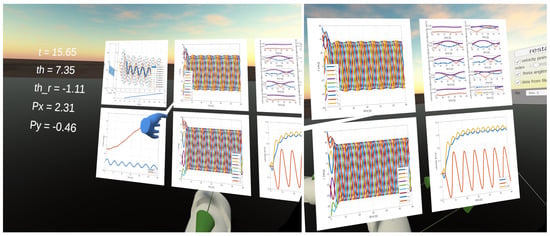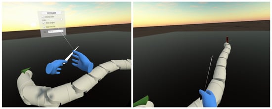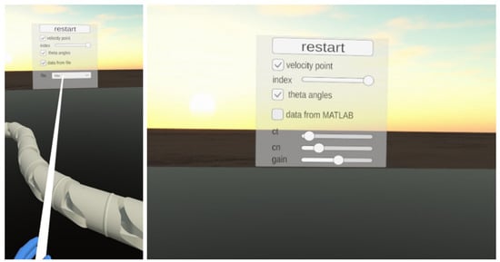 The Unity game engine provides a way to display an interactable Graphical User Interface (GUI) in VR. The GUI consists of elements such as sliders, drop-down lists, and push/toggle buttons, and the user interacts with them by casting a ray from the controllers, as shown in Figure 6. In our program, the GUI is stationary and located in front of the default camera position. It enables the user to restart the simulation and change the data source. There are two simulation modes available. In the first “off-line” mode, an application reads previously calculated data from a text file generated by MATLAB. In this mode, the GUI displays a drop-down list with all files uploaded to the application.
