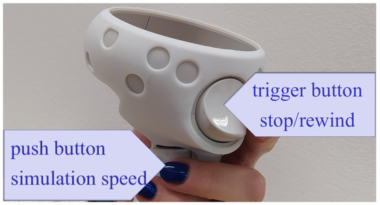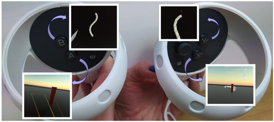 The implemented program allows running simulations on Oculus Quest 2 (Meta Quest documentation, http://developer.oculus.com/documentation, Access date: 3 February 2023), a VR headset developed by Oculus, a division of Meta. It is a standalone device that can run games and software wireless under an Android-based operating system. It supports positional tracking with six degrees of freedom, using internal sensors and an array of cameras in the front of the headset rather than external sensors. An Oculus Quest 2 set consists of VR goggles with a resolution of 3664 × 1920 (1832 × 1920 per eye) and a refresh rate of 90 Hz, and two symmetric controllers enabling tracking of the user’s hands. They allow the user to interact with the virtual environment by pointing at objects with a ray or pressing the controller’s buttons.
