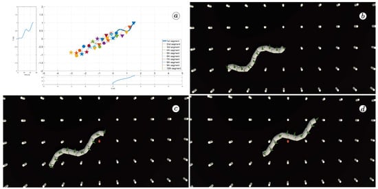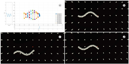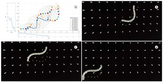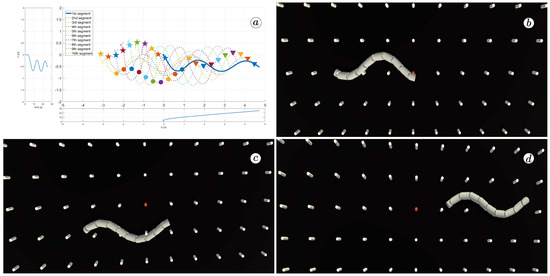 The gait pattern of a snake robot’s commonly used control system is lateral undulation, described in [31]. The dynamical analysis of various snake robot motion patterns can be found in [32], and the performance of different motion strategies is discussed in [33]. For the lateral undulation pattern, each joint angle i of the robot, where i belongs to the set , is controlled using the following equation