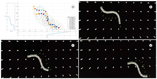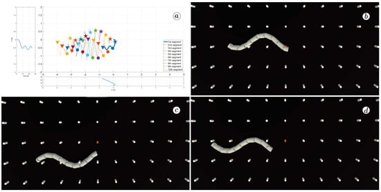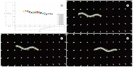 The VR environment includes a red cylinder to represent the location of the destination point that the robot is following. In “off-line” mode, the destination position and reaching time are saved in a file. In “real-time” mode, the user marks the desired position on the floor with controller rays and clicks the trigger button to confirm the new position. The application sends the reference point to MATLAB via a TCP protocol, and the control algorithm calculates the target trajectory. The robot’s segment’s calculated positions are sent back to Unity, and the robot’s configuration is displayed in VR. If the user assigns a new target position, the algorithm restarts, and the snake robot returns to the origin. This allows the user to observe the algorithm’s performance and compare results for different parameters.