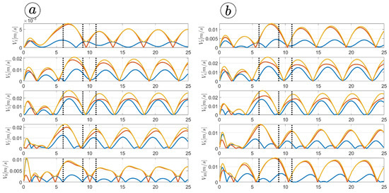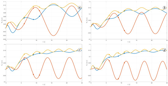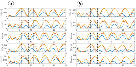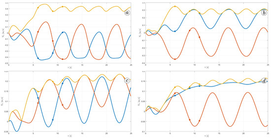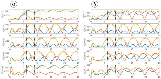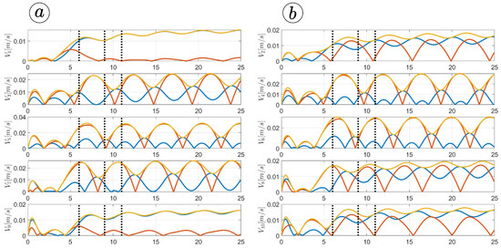 Figure 26 shows the velocity of the robot head. The absolute value of the velocity is marked by the yellow line, the component of the velocity along the x-axis of the global coordinate system is marked by the blue line and the component of the velocity along the y-axis of the global coordinate system is marked by the red line. The robot’s velocity increased with larger ; however, there is no significant difference between and .