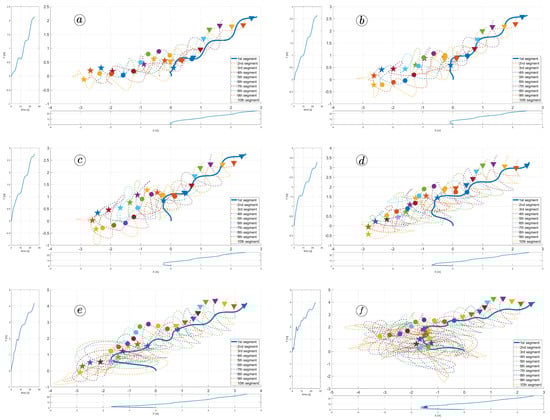 Trajectories of robot segments for (a), (b), (c), (d), (e), and (f).