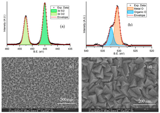 Characterization of an In2O3−x 500 nm thick film deposited on a glass substrate: XPS spectra showing peaks for indium (a) and oxygen (b); SEM analysis at 105 (c) and 3 × 105 (d) magnification.