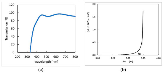 where λ = 0.154 nm and B is the measured broadening of the diffraction line peak at the angle 2θ at half its maximum intensity. The average crystal size in our films was determined to be in the range 70–80 nm by a Gaussian fit of the 222 peak and then using Equation (8). This value is almost equal to the grain size as from SEM images, evidencing the crystalline nature of the grains. The average crystal size found in our samples was more than double the size than that for InOx prepared by DC magnetron sputtering and same rate deposition [44,46]. The optical transmission, T(ν), of a In2O3−x film deposited on a quartz substrate as a function of the wavelength is shown in Figure 4a. From data, the absorption coefficient of the film as a function of the wave frequency, ν, can be obtained: