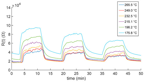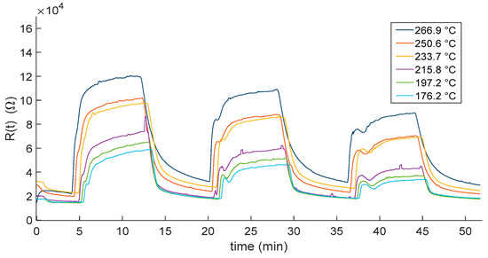 As expected, the responses show that the film resistance decrease with increasing temperatures. Moreover, temperatures higher than 200 °C negatively affected the reactivity of the sensor. Indeed, for both the carrier gases, at the lower displayed temperatures, the sensor response did not reach the steady state, showing the need of a longer recovery time with respect to the one set for the measurement protocol (8 min). This may represent a limitation on the use of this kind of sensor in, e.g., alarm systems and environmental monitoring, where short recovery times are needed.