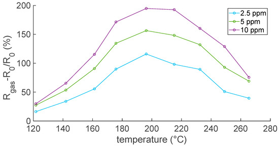 In this regard, the experimental results in Figure 8 and Figure 9 show that the response to NO2, evaluated according to Equation (8), increased with temperatures up to 200 °C, where the optimal operating temperature was reached, and then decreased. This is a typical behavior for MOX sensors.