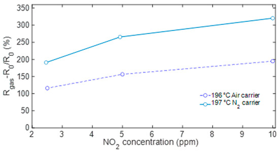 Finally, Figure 10 reports the sensor response as a function of the NO2 concentration: the plot compares results evaluated at the optimal temperature in air and N2.