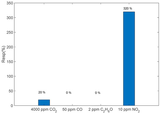 Finally, the sensor cross-sensitivity to CO, CO2 and C2H6O was evaluated. CO and CO2 are among the most common interfering gases, with respect to NO2, involved in combustion processes, and the concentrations chosen for this evaluation are typical for exhaust gas emissions and are of interest for the applications for which the sensor was conceived. On the other hand, the cross-sensitivity to ethanol can give a good insight into the possible response to volatile organic compounds (VOCs). Reported data in Figure 11 refer to sensitivities evaluated at the optimal temperature. They show a satisfactory performance in terms of NO2 selectivity.