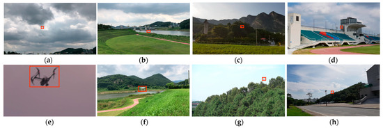 Screenshots taken from our dataset: (a) cloud background, (b) river background, (c) mountain background, (d) building background, (e) large target, (f) medium target, (g) small target, and (h) tiny target.