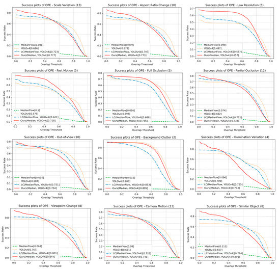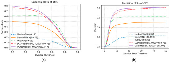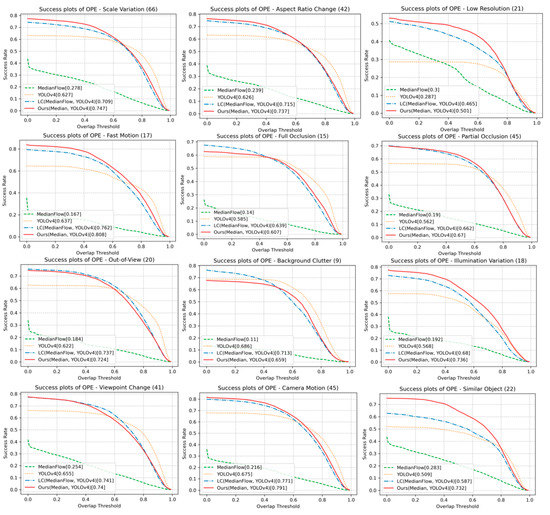 The reason for the high success score under SV, ARC, IV, and POC includes that the target’s appearance changes are treated well by the proposed online learning. Our online learned classifier also allows handling SOB. As shown in FM and CM, the proposed method’s detector helps to re-track when the target is missing. Our tracking under LR, thanks to the MedianFlow, is suitable for tiny object tracking. This comparison shows that the proposed method takes advantage of the detector and the tracker. On the other hand, the performance of the proposed method is slightly less than the YOLOv4 or LC method in FOC, OV, BC, and VC, likely because model updating is often accompanied by a dilemma. Note that a model may not catch the appearance changes without online updating, but the updating by an appearance that is not the intended target could bring the risk of encountering the problem of drifting.