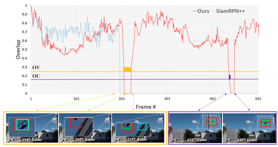 As mentioned previously, a tracker can easily drift to the background due to real-world challenges, e.g., occlusion and out-of-view problems; thus, it is important to determine whether the object is, in fact, present. To evaluate this, we used the mSA metric. Table 3 shows that the proposed method achieved the best mSA score of 0.553, which indicates that the proposed method belongs to the top three in terms of SA for all test sequences. The proposed method was able to perceive the object’s absence. Even though the SiamRPN++ method obtained the best SA score for Seq3, Seq7, and Seq11, it is limited in terms of handling occlusions and out-of-view situations, as demonstrated by Seq1, Seq2, Seq4, Seq6, and Seq8. Occlusion and fully out-of-view cases are generally major problems in object tracking tasks. If the tracker does not employ a strategy to update the model, the tracker may easily drift from the correct target to various distractors. To prove that the proposed method can handle such distractors appropriately, the representative quantitative results of the proposed method are compared to those of SiamRPN++ in terms of IoU overlap in Figure 5. In Seq2, the object left the view and became occluded. The proposed and SiamRPN++ methods encounter the problem of drifting to the background after frame 195. As a result, the SiamRPN++ lost the target. However, the proposed method could recover the track in frame 225 by the detection mechanism. Figure 5 shows that the proposed method maintains the tracking after the occurrence of occlusion in frame 435, by taking advantage of the redetection process.