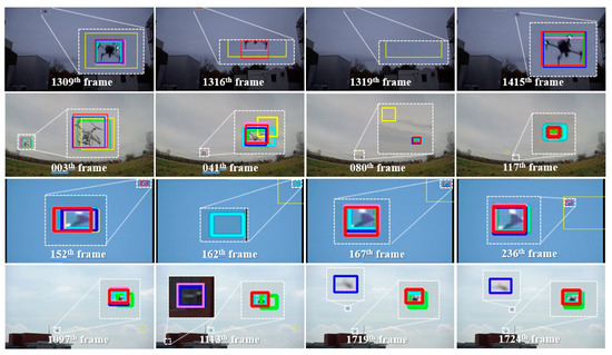 As described in Section 1, tracking small flying objects, e.g., UAVs, is challenging due to insufficient availability of features to inform the object, and large interframe disparity to surveil rapid objects. When the tracker suffers from problems caused by these issues, a mechanism similar to redetection can realize significant improvements. Therefore, an approach that uses detection and tracking together has been studied to improve robustness of the tracker. For example, Saribas et al. [6] exploited YOLOv3 to detect a target object in the first frame and recover tracking failures, and they used the KCF to track the object. This mechanism relied on the confidence score of the KCF to switch between the detector and tracker. When the score is under a given threshold, the target’s new position is selected according to Euclidean distances and the IoU ratio between candidates from the detector and the tracker’s most recent output. In addition, Cintas et al. [36] utilized YOLOv3-Tiny and the KCF, and they activate a switch mechanism every 30 frames, or in cases where the tracker fails. Then, based on the Euclidean distance between the predicted results by the detector and the latest result produced by the tracker, the result with the closest location is considered the target. Wang et al. [5] proposed a hybrid detector–tracker for birds and nests. Here, if the disagreement measure derived by bounding boxes from the detector and tracker is less than a given threshold, the target is localized by a linear combination of the detector and tracker. If the disagreement measure satisfies the threshold, the bounding box of the detector is determined to be the target. Although the approaches in [5,6,36] are fast and straightforward, the target is localized using only the bounding box (rather than appearance features); thus, this approach is ineffective at handling the tracking drift problems. Therefore, a sophisticated mechanism is required to track UAVs in real-world situations.