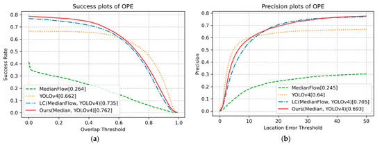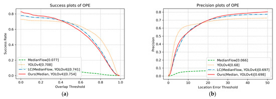 The OPE technique runs an algorithm with initialization from the ground truth in the first frame and reports the average precision or success rate of all results [3,47]. Following the evaluation protocol of OPE [3], Figure 4 shows that the proposed method with MedianFlow and YOLOv4 achieved the best success score of 0.747 at a threshold value of 0.3. Thus, the proposed method outperformed the LC [5] (0.719) and YOLOv4 (0.618) methods. In addition, the proposed method produced the best precision score of 0.797 at a threshold value of 20. Compared to the LC method, the proposed method realized a 2.8% improvement in terms of overlap, and a 2.9% improvement in terms of precision. YOLOv4 obtained the best performance when the threshold in the success plot was greater than approximately 0.6, and when the threshold in the precision plot was less than 5. These results indicate that YOLOv4 most accurately predicted the bounding box. Russakovsky et al. reported that humans have difficulty distinguishing an IoU of 0.3 from 0.5 [54]. Accordingly, if the IoU threshold value of 0.3 is considered sufficient to realize steady tracking, tracking methods that incorporate both detection and tracking, e.g., the proposed method and LC method, will exhibit robust performance. In particular, the proposed method is more robust than the LC method, which only uses the location of the bounding box.
