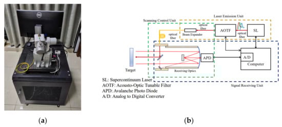 Figure 1 shows the structure of a hyperspectral LiDAR system which consists of an emission unit, an integrated scanning control unit, and a receiving unit. The emission unit’s acoustic-optically tunable filter (AOTF) provides a detection laser with a spectral resolution of 5 nm from 550 nm to 1050 nm by filtering the outgoing laser from the super continuous laser. The HSL system emits a 10 mm diameter laser beam with a divergence angle of 1 mrad, and the transmitted laser beam is collimated by a collimator with a focal length of 33 mm, resulting in a 5–8.5 mm spot diameter of the emitted laser after collimation. A two-axis rotator of a scanning control unit conducts precise scanning to generate final colorful point cloud of a target. The laser echoes reflected from the target are focused on an avalanche photon diode (APD) by the receiving optics, which are captured and stored by a high-speed data acquisition card (AC) for subsequent processing.